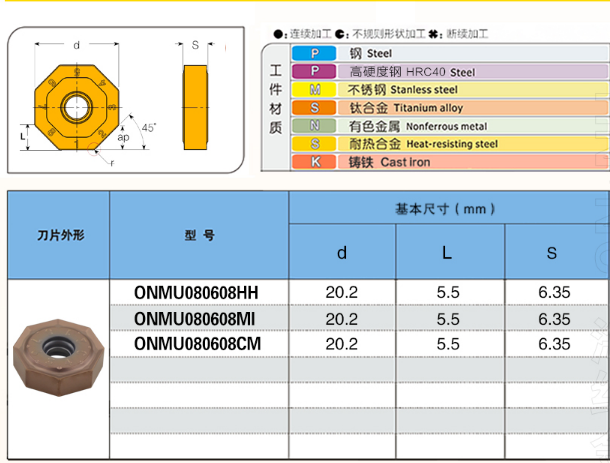 Milling Inserts ONMU080608 CNC Carbide ເຄື່ອງມືຕັດ